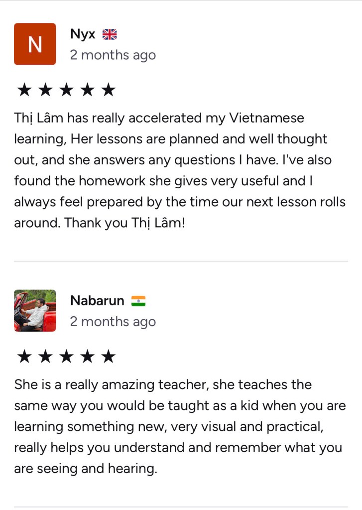 Most of my students start speaking basic Vietnamese after just a few lessons, and many continue learning with me long-term.